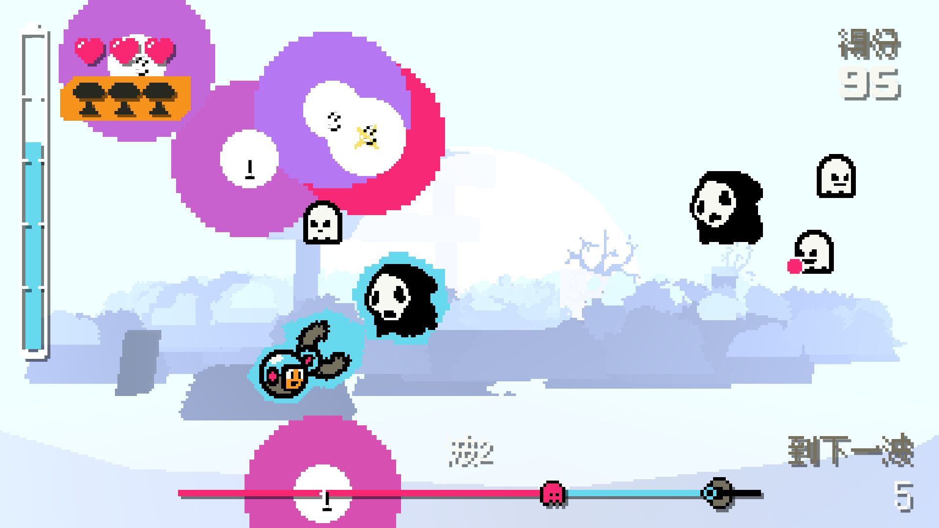 使出攻击光束! 将幽灵连在一起,然后一次性将它们全部弹出,以在无尽“子弹地狱”的末日商店获得积分。